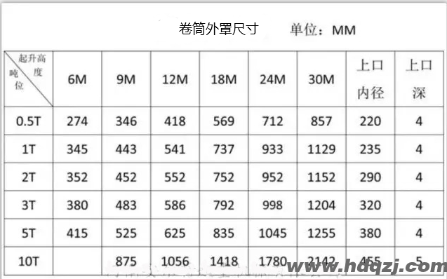 電動(dòng)葫蘆卷筒的起重量主流的有5t、1t、2t、3t、5t、10t、16t等,對(duì)應(yīng)的卷筒外罩的具體型號(hào)如下: