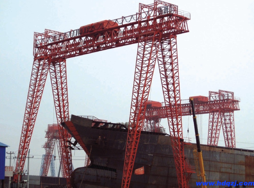 門式結(jié)構(gòu):造船門機采用門式結(jié)構(gòu),由兩個垂直立柱和一個橫梁組成。立柱通常是鋼制的,用于支撐和穩(wěn)定橫梁。橫梁上安裝有起重機組件,如起重機鉤、電動機和傳動裝置。